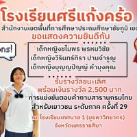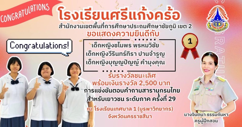 โรงเรียนศรีแก้งคร้อ สพป.ชัยภูมิ เขต 2 ขอแสดงความยินดีกับตัวแทนนักเรียนที่คว้า รางวัลชนะเลิศ พร้อมทุนการศึกษา 2,500 บาท ในการแข่งขันตอบคำถามสารานุกรมไทย สำหรับเยาวชน ระดับภาค ครั้งที่ 29