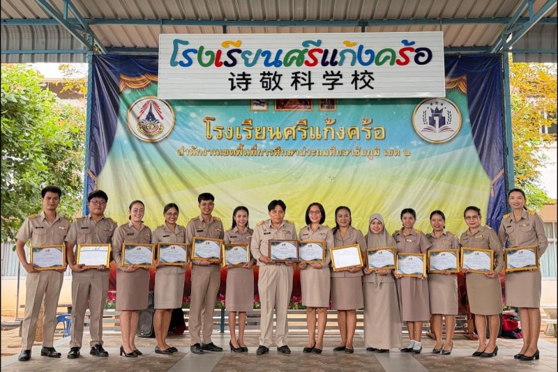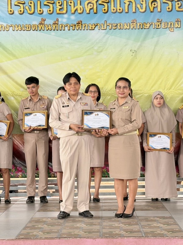 ดร.วุฒิพงษ์ วงษ์ชู ผู้อำนวยการโรงเรียนศรีแก้งคร้อ มอบเกียรติบัตรให้ผู้บริหารและคณะครูที่ได้เข้าร่วมสนับสนุนการนำเสนอผลงานนวัตกรรมเพื่อยกระดับคุณภาพการจัดการศึกษา ระดับประถมศึกษา ด้วยรูปแบบ Active Learning GPATS5 (ครูต้นแบบ) เพื่อสร้างต้นแบบการพัฒนาในเขตภาคตะวันออกเฉียงเหนือตอนล่าง