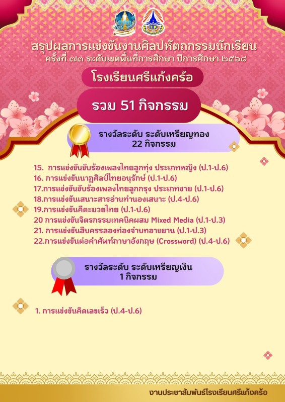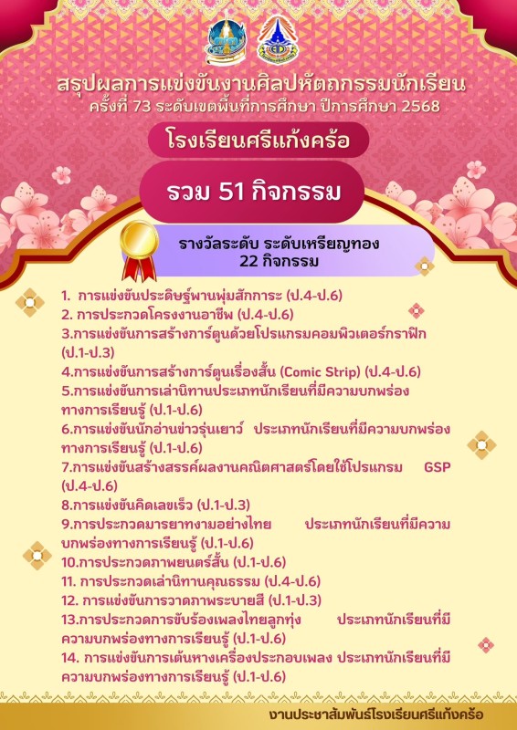 โรงเรียนแก้งคร้อ สรุปผลการแข่งขันงานศิลปหัตถกรรมนักเรียน ครั้งที่ 73