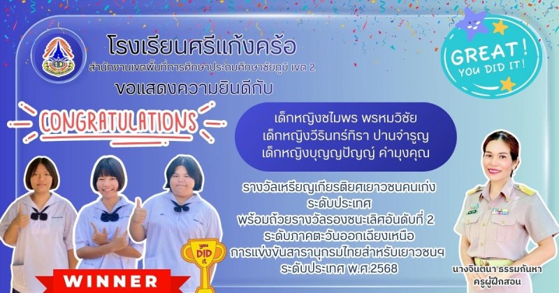 โรงเรียนศรีแก้งคร้อ สำนักงานเขตพื้นที่การศึกษาประถมศึกษาชัยภูมิ เขต 2 ขอแสดงความยินดีกับนักเรียนที่สร้างชื่อเสียงให้กับสถานศึกษา ในการแข่งขัน สารานุกรมไทยสำหรับเยาวชนฯ ระดับประเทศ พ.ศ. 2568 โดยได้รับรางวัลดังนี้: